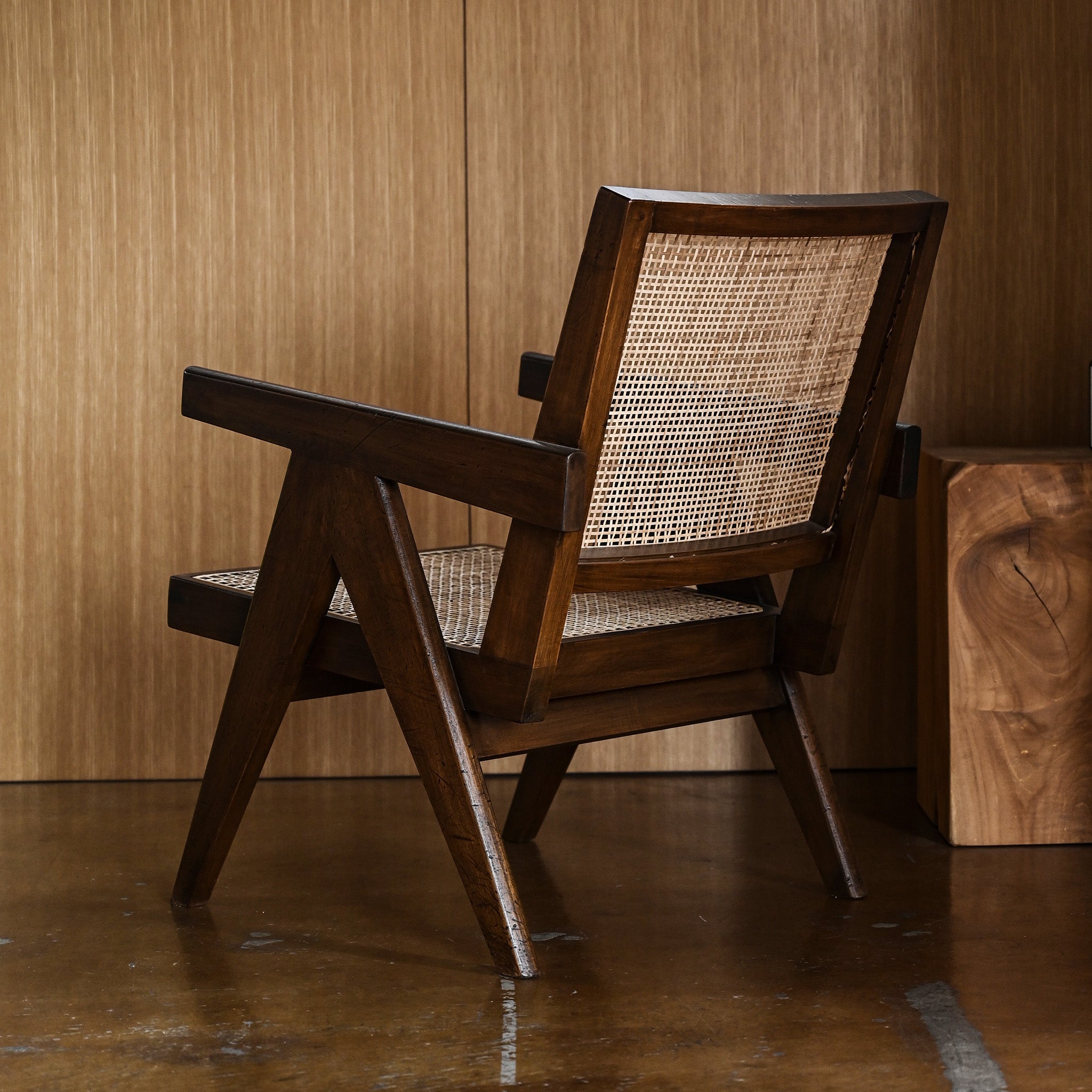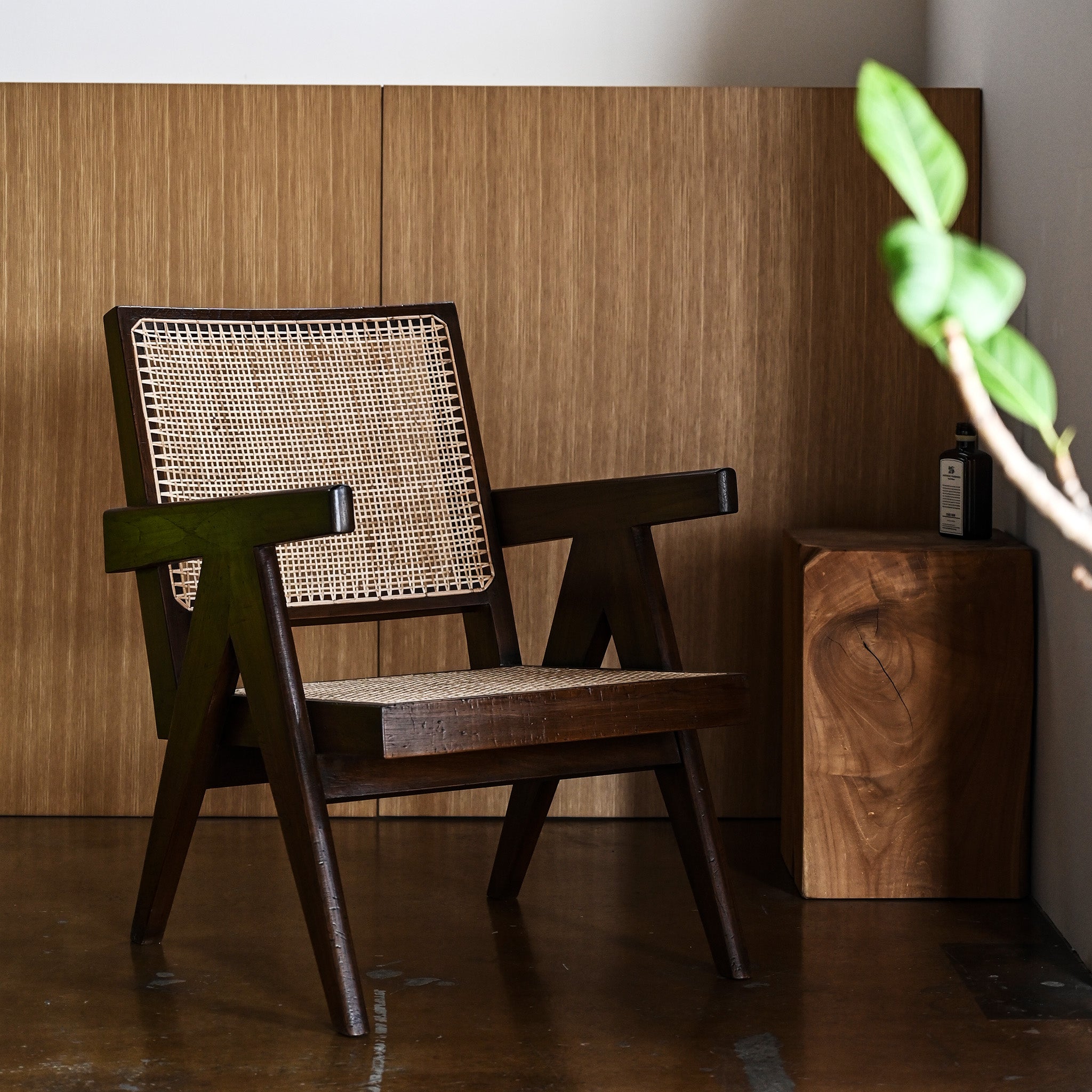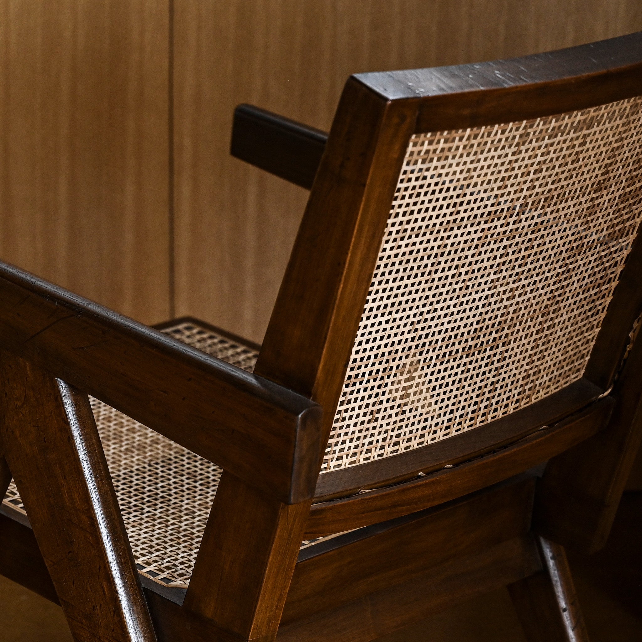 Easy Arm Chairは、ピエール・ジャンヌレが発表した1955-1956年に「Cane and Teakwood Arm Chair」という名で発表されました。大学の住宅や管理棟で使用されたArm Chairは、スイス国立博物館とチャンディガール私立博物館に現在も展示されております。PJ-SI-29Aというこのモデルは、非常に強固なチーク材の構造はVレッグとも言われ、代表的なモデルです。わずかに傾斜した座面と背もたれは、ラタンのクッション性と合わさり、絶妙な座り心地を実現しています。
