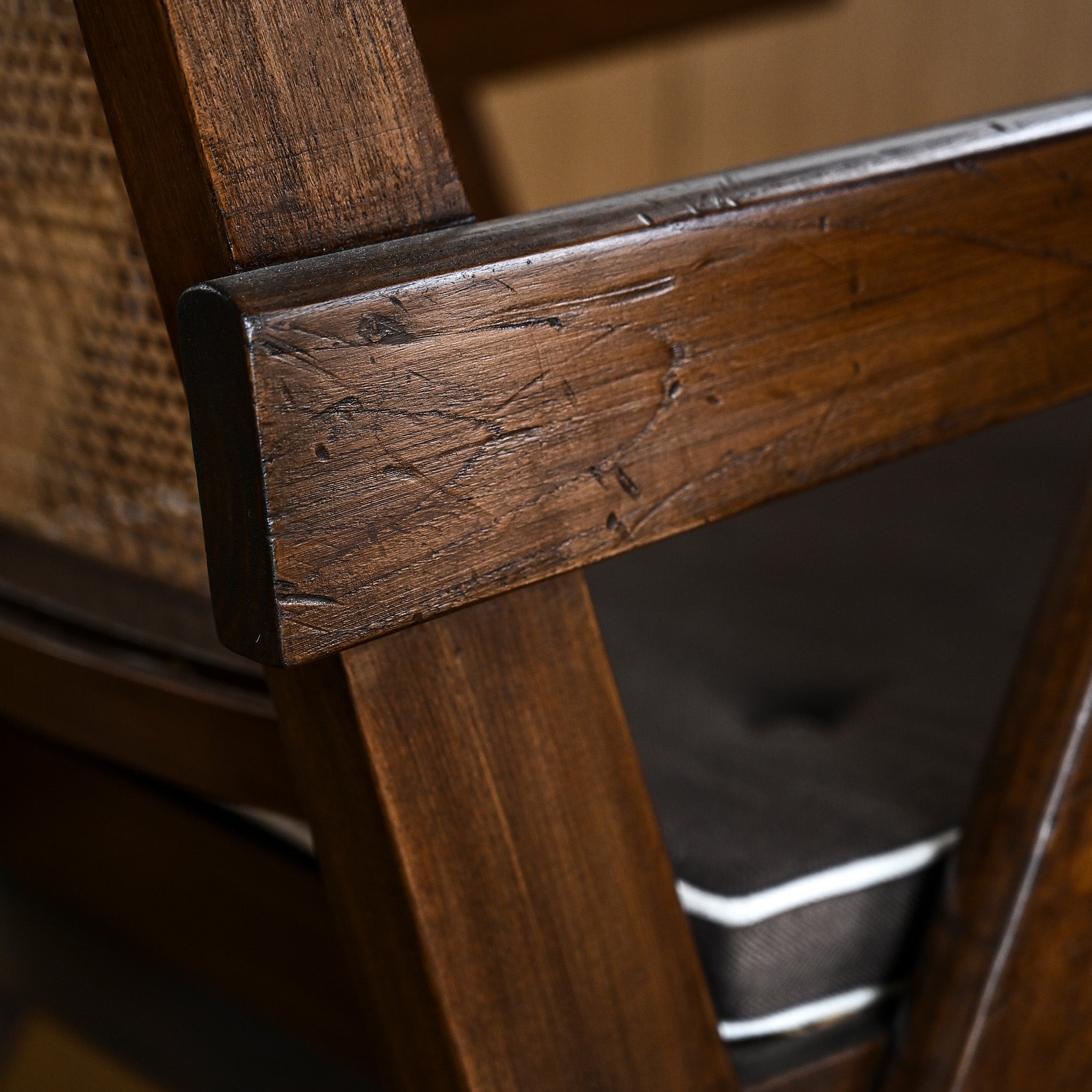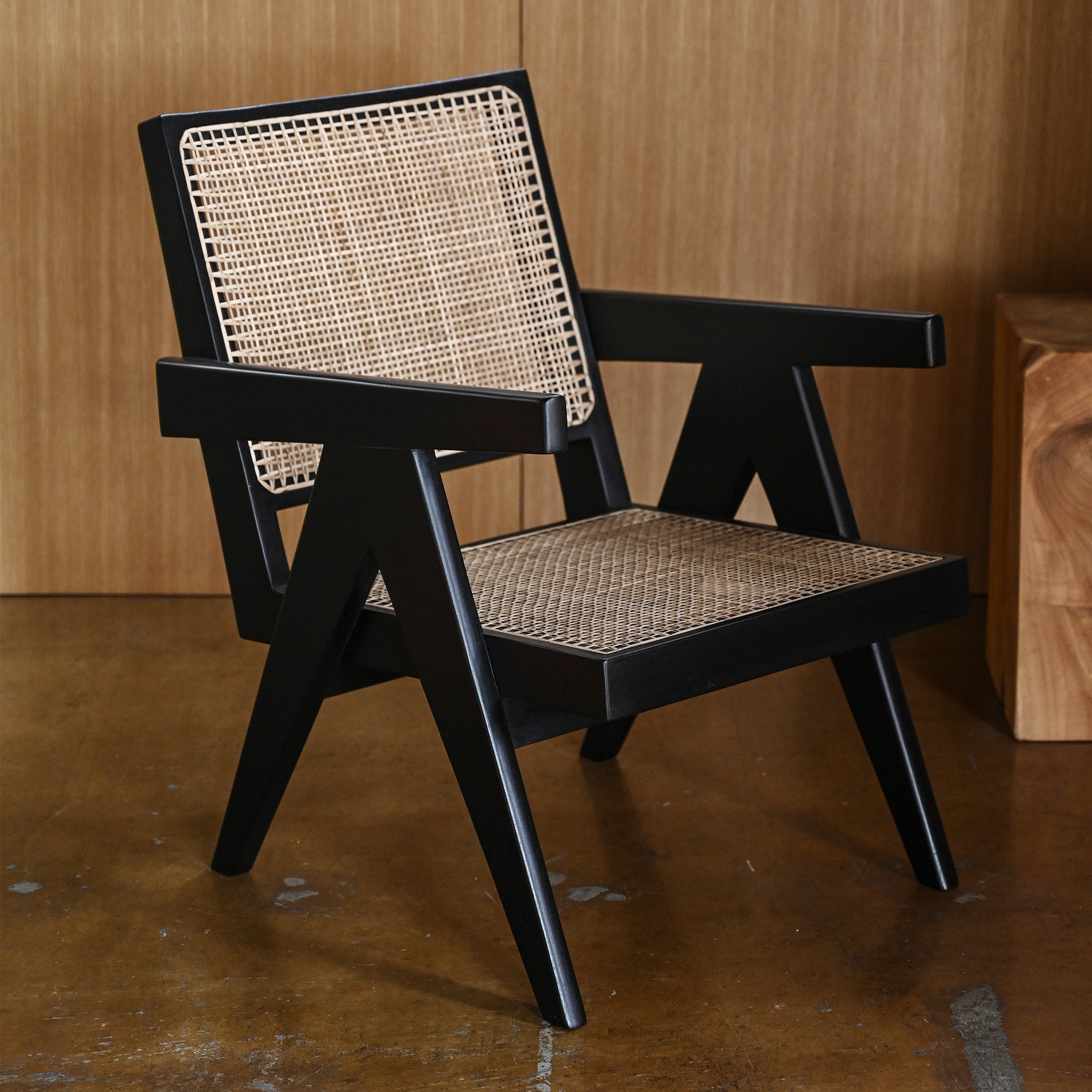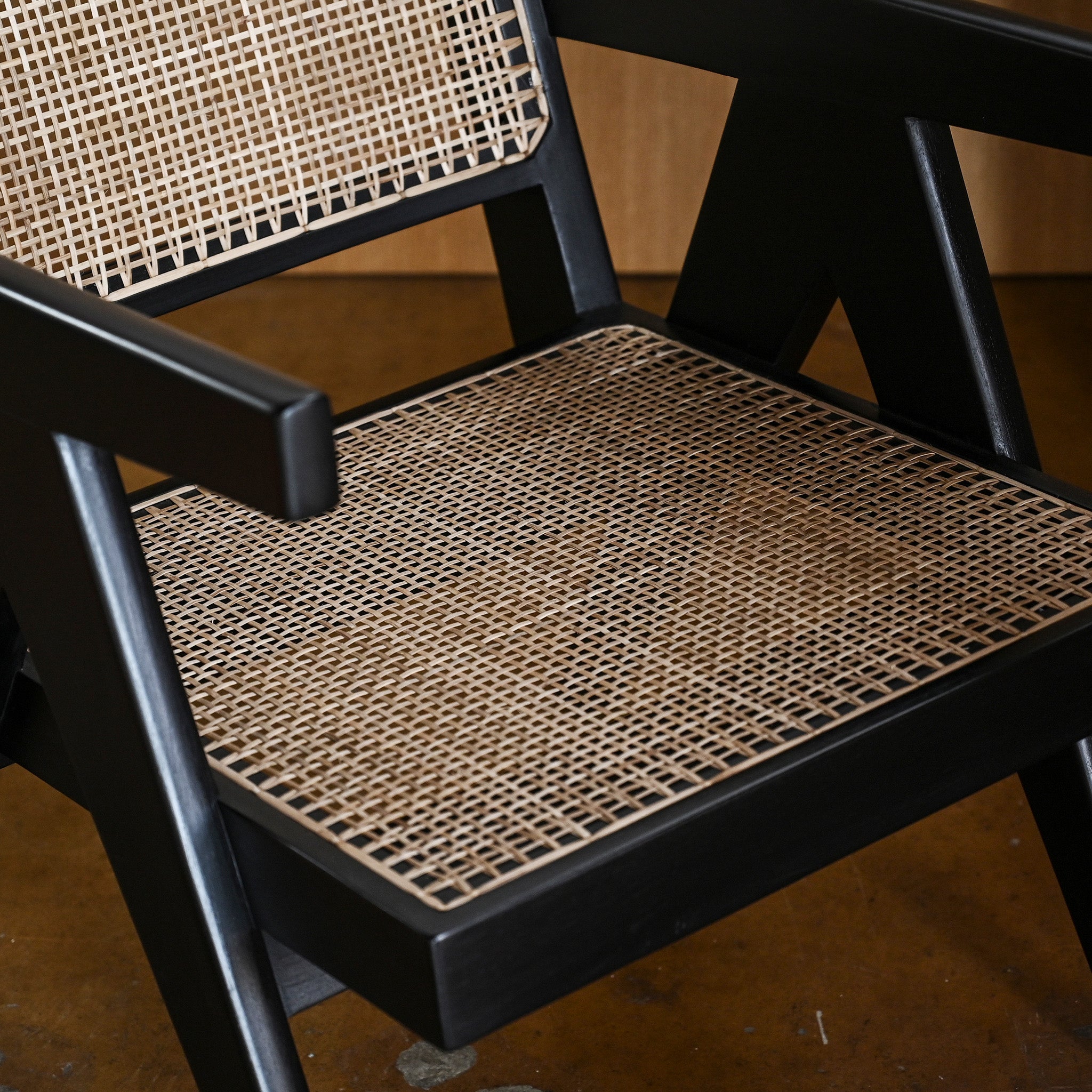 Easy Arm Chairは、ピエール・ジャンヌレが発表した1955-1956年に「Cane and Teakwood Arm Chair」という名で発表されました。大学の住宅や管理棟で使用されたArm Chairは、スイス国立博物館とチャンディガール私立博物館に現在も展示されております。PJ-SI-29Aというこのモデルは、非常に強固なチーク材の構造はVレッグとも言われ、代表的なモデルです。わずかに傾斜した座面と背もたれは、ラタンのクッション性と合わさり、絶妙な座り心地を実現しています。