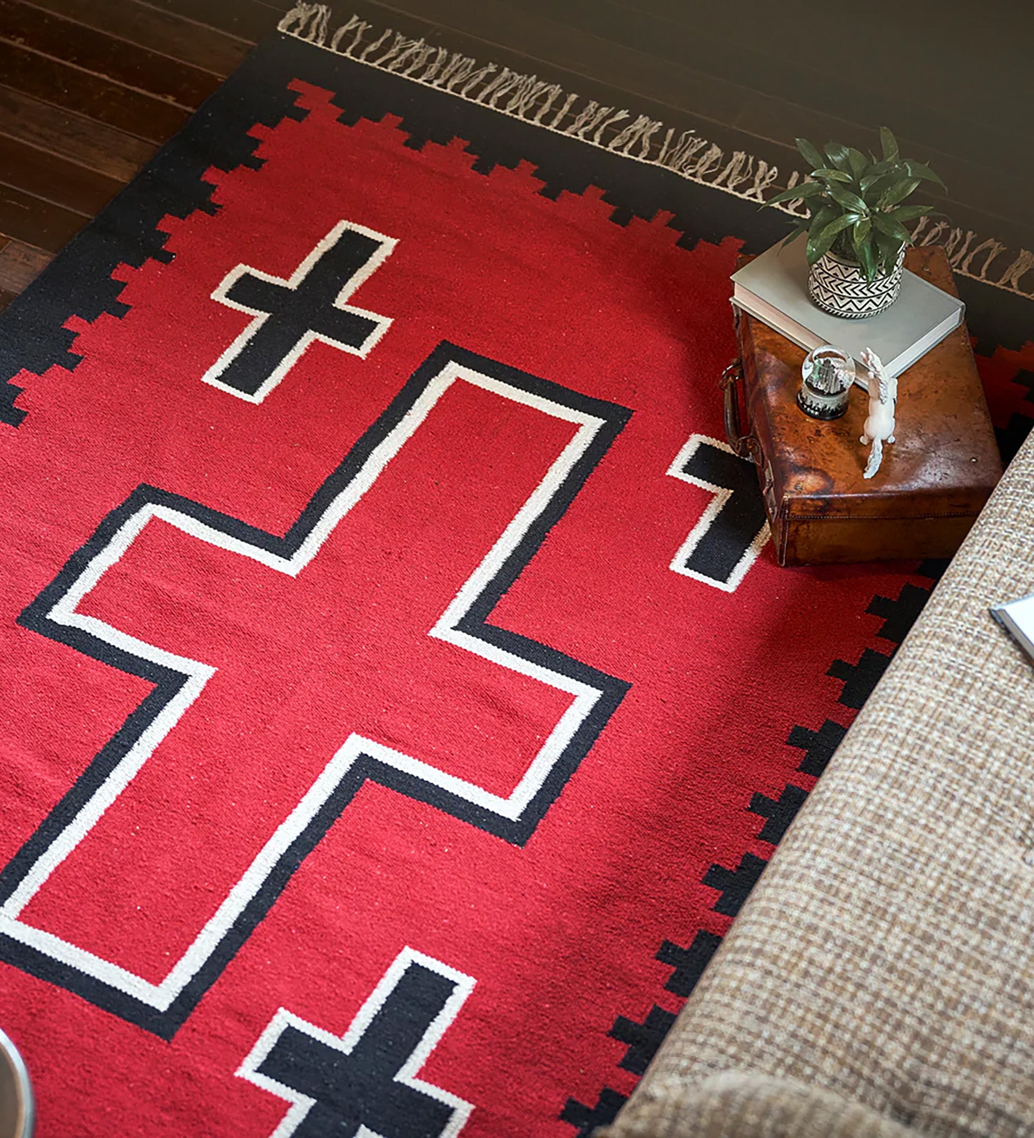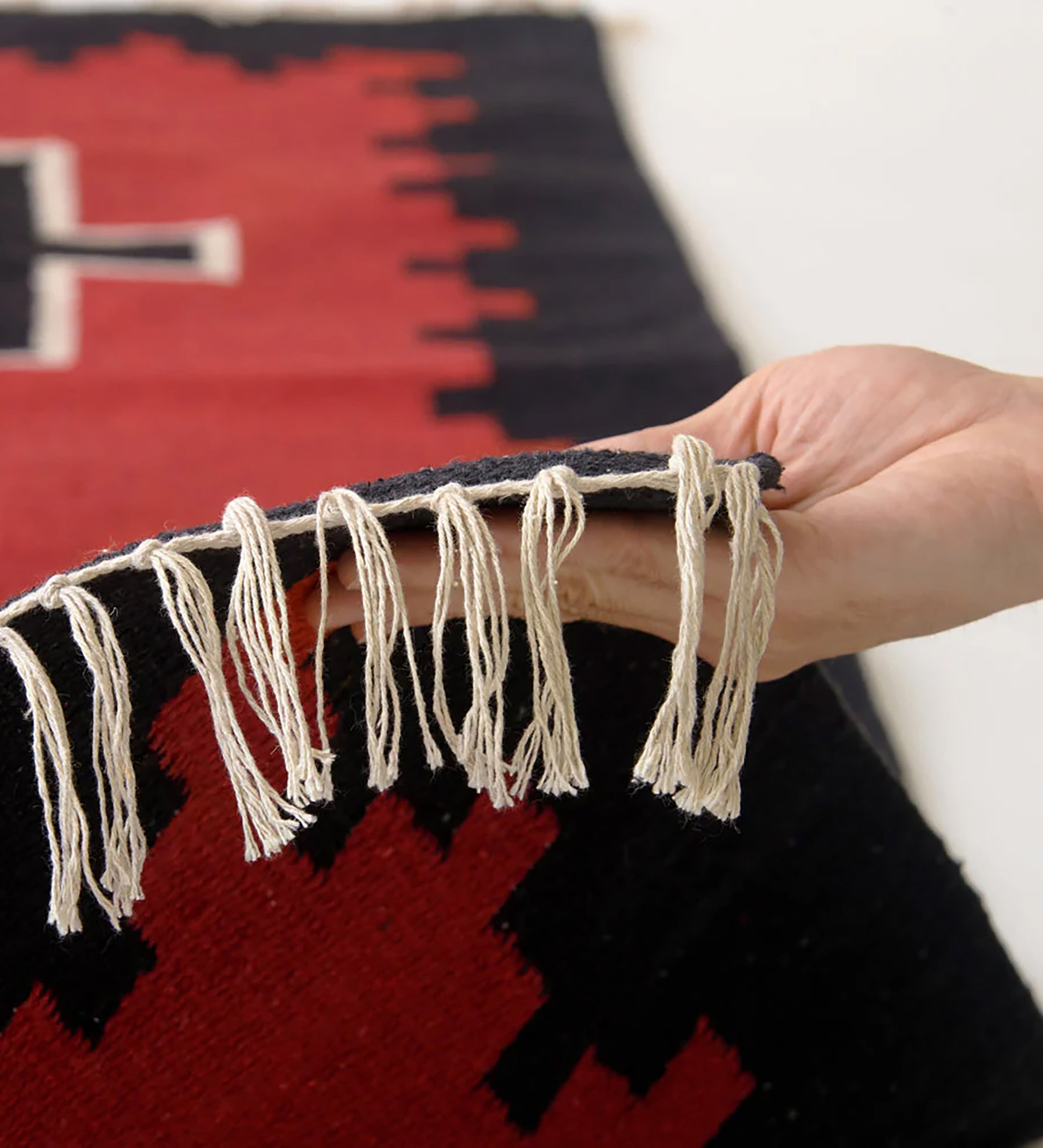 レッド×ブラック×アイボリーの伝統的なガナド織りのカラーリングが印象的なコットンラグのガナード。