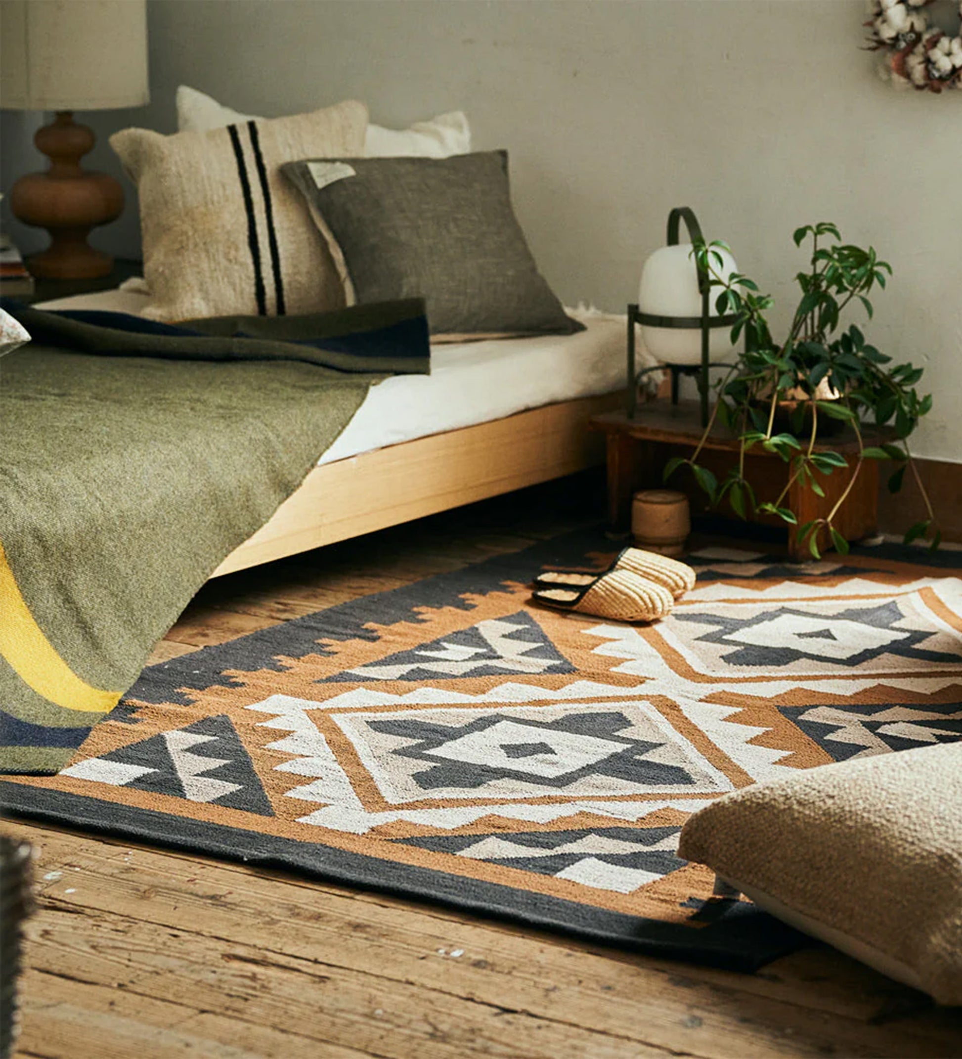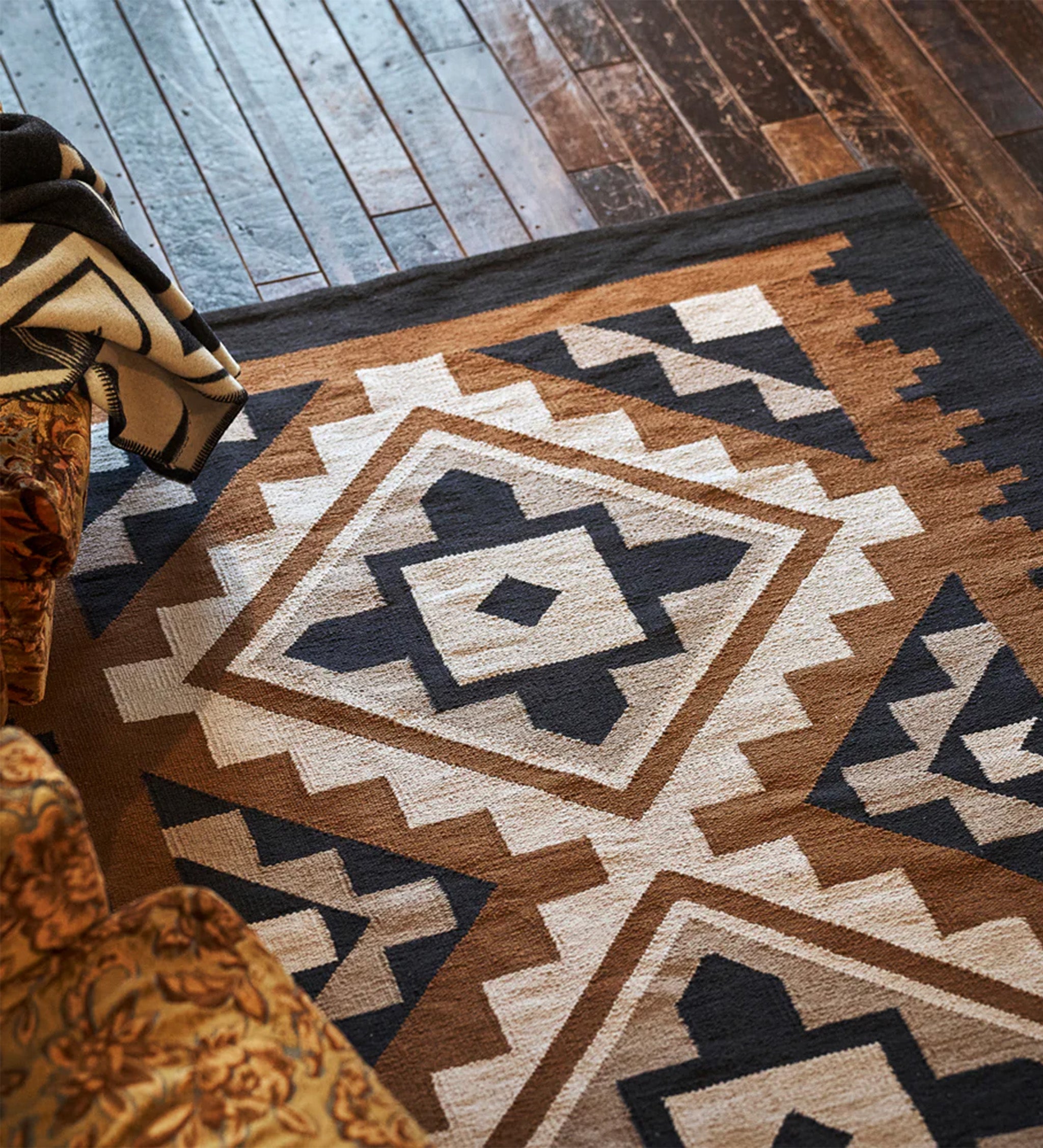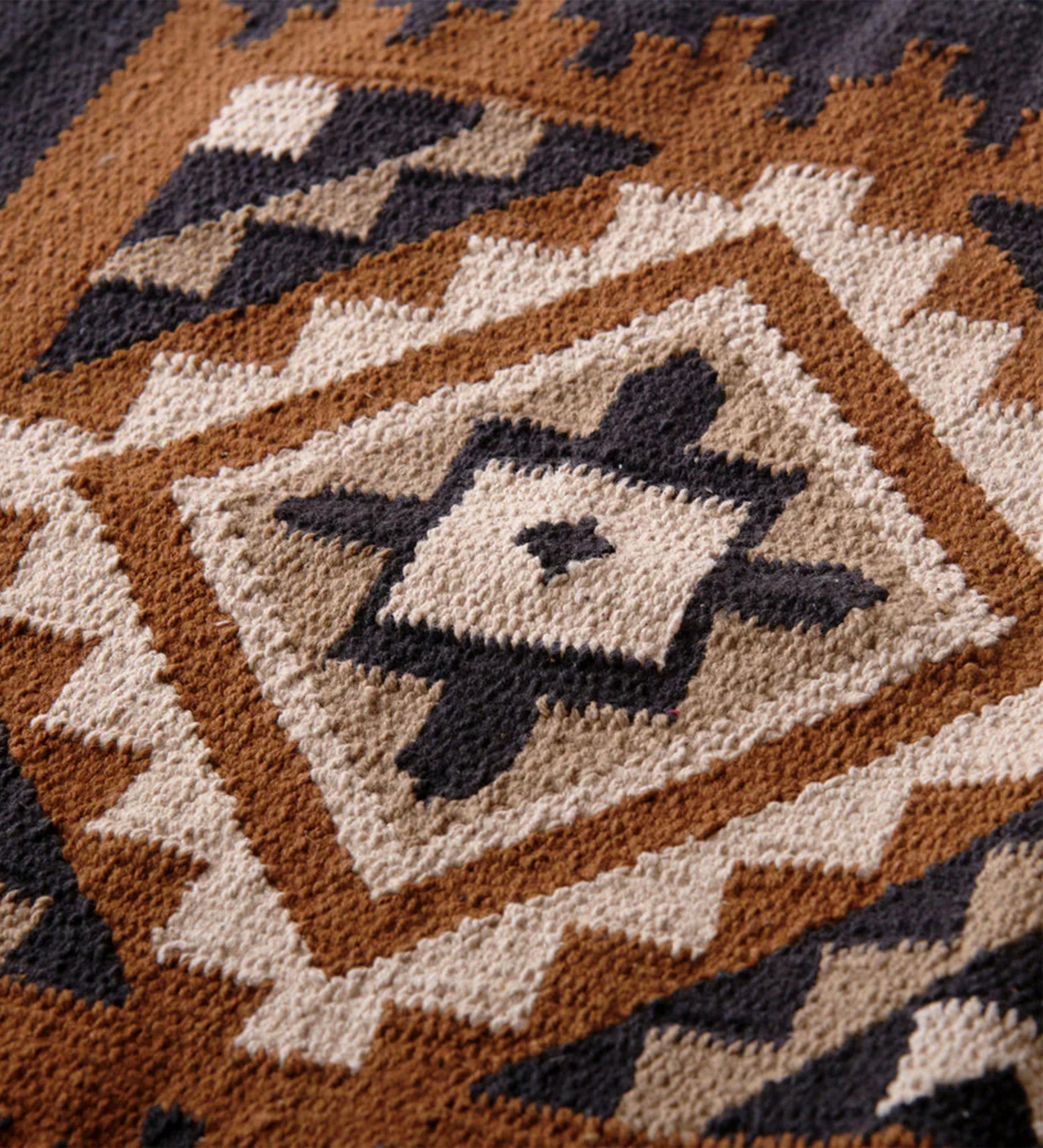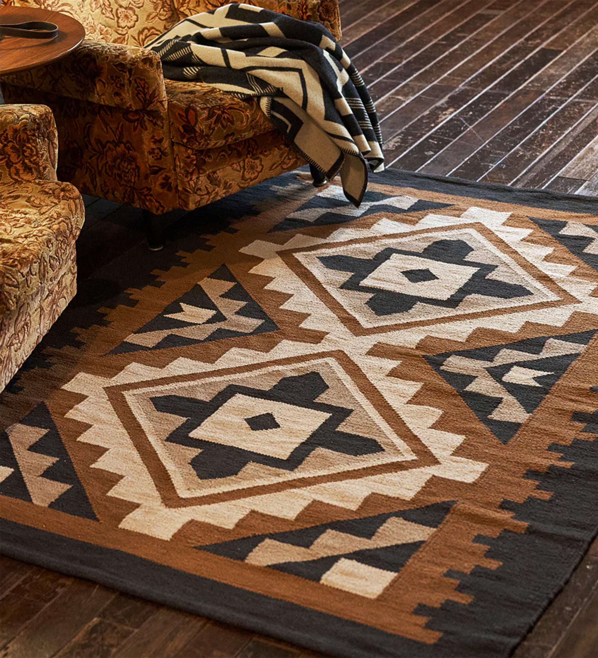 明るめのブラウン・ベージュ・ブラックで構成されたパターンのコットンラグは、木製やスチール製、エスニック調の家具と組み合わせると、レトロながらもモダンで洗練された印象に。