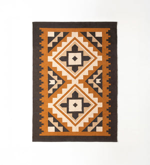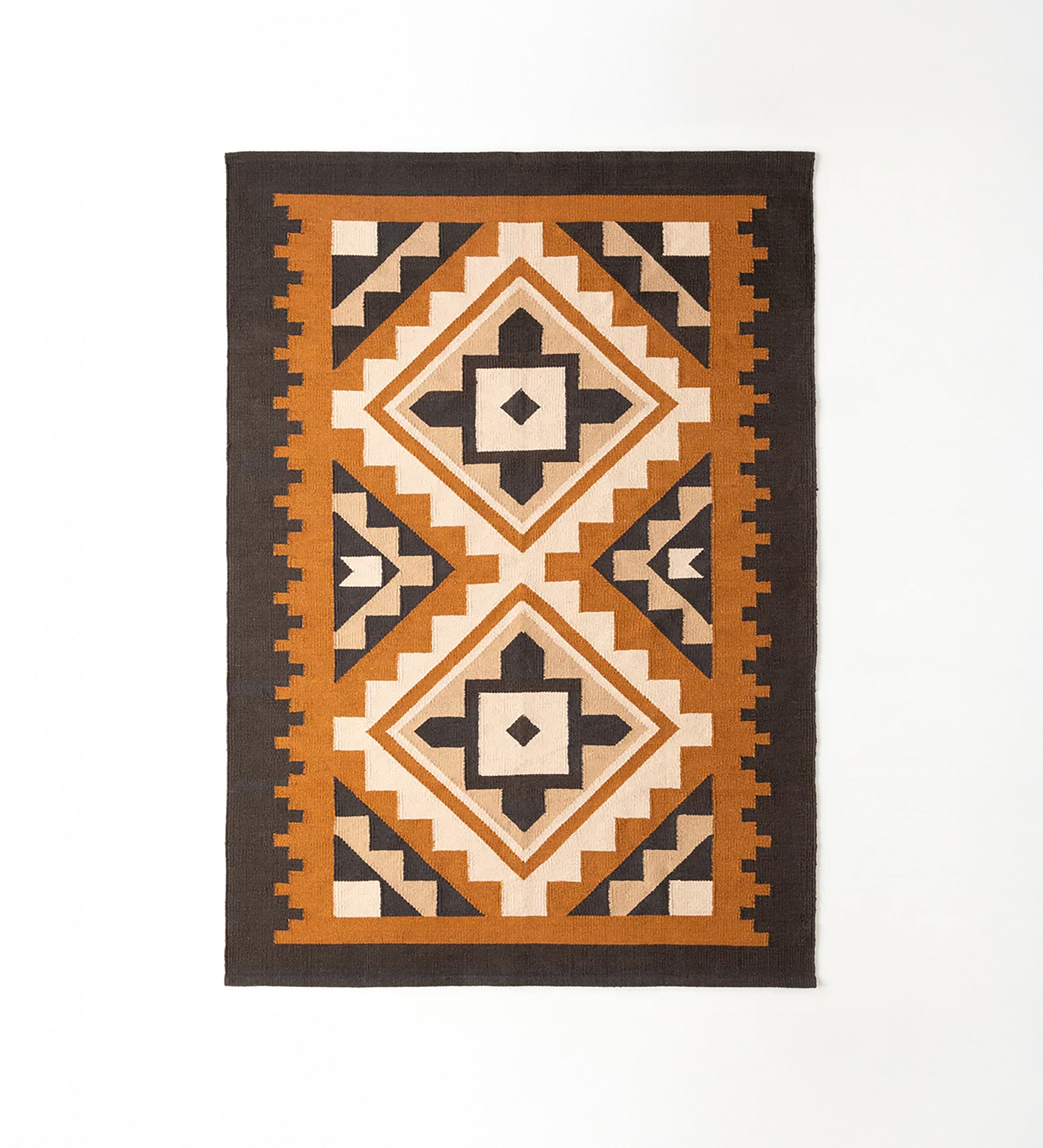 ネイティブアメリカンの伝説中の4コーナーズという場所を表すダイヤモンドパターンを、階段状の三角形で縁取った伝統的なデザインのラグ。
